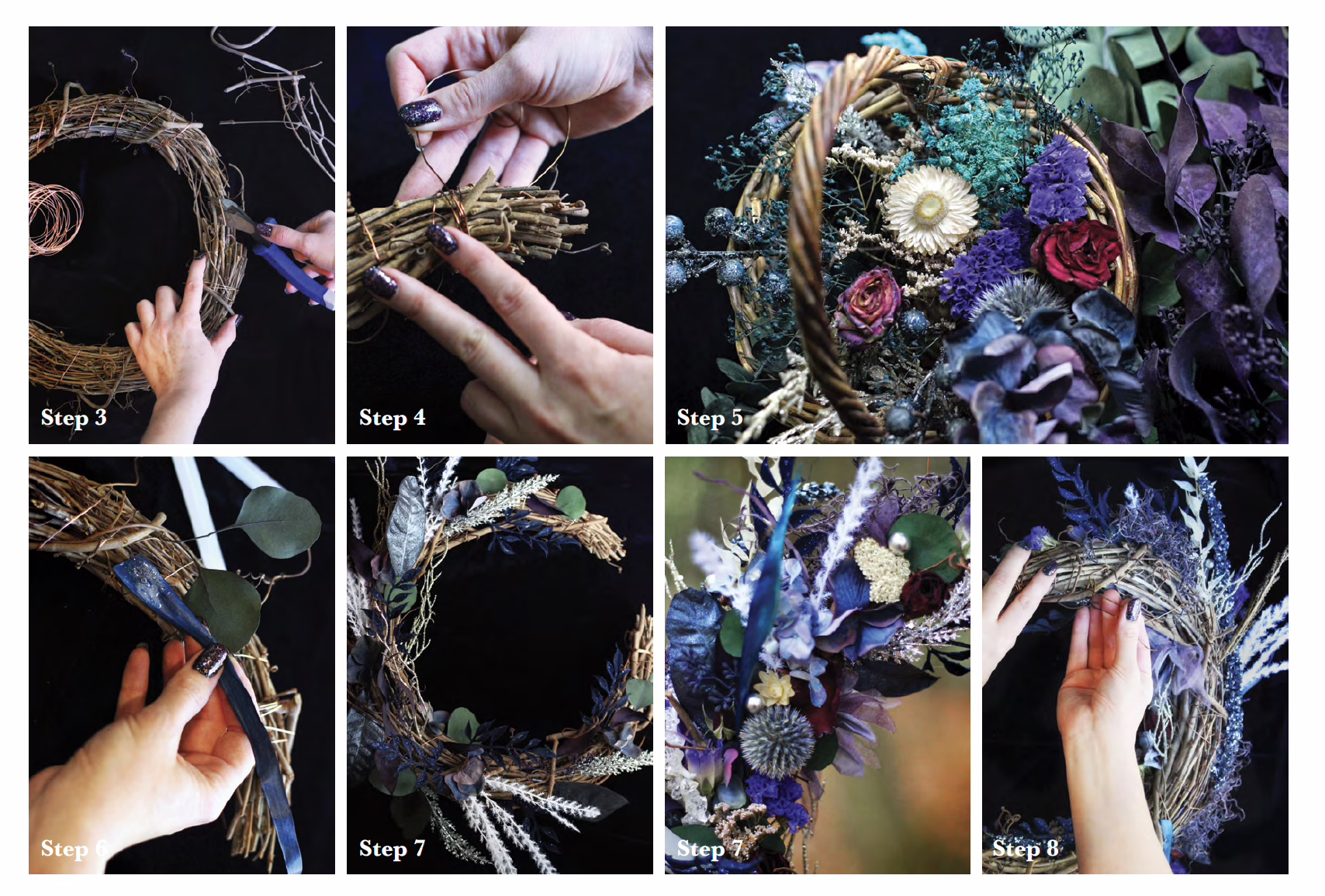 Step 5: Now what on Earth are we going to cover this grapevine with? Truly the options are infinite. If you forage or grow your own flowers, you can easily dry them with silica gel or hang most flora up to dry. Do not feel you have to only use dried flowers. I often use a mix of artificial flowers and natural ones. In fact, I grew up helping my mother change our huge grapevine wreath every season. We used artificial flowers and would simply wedge the stems into the tight weaves of the vines. No gluing or securing with wire or tape. Since it was completely artificial flora, we could leave our wreath on our front door (purple, of course) in the elements all year. I’d reckon that wreath is at least thirty years old. Bonus: We used the same flowers repeatedly, simply in different arrangements.
