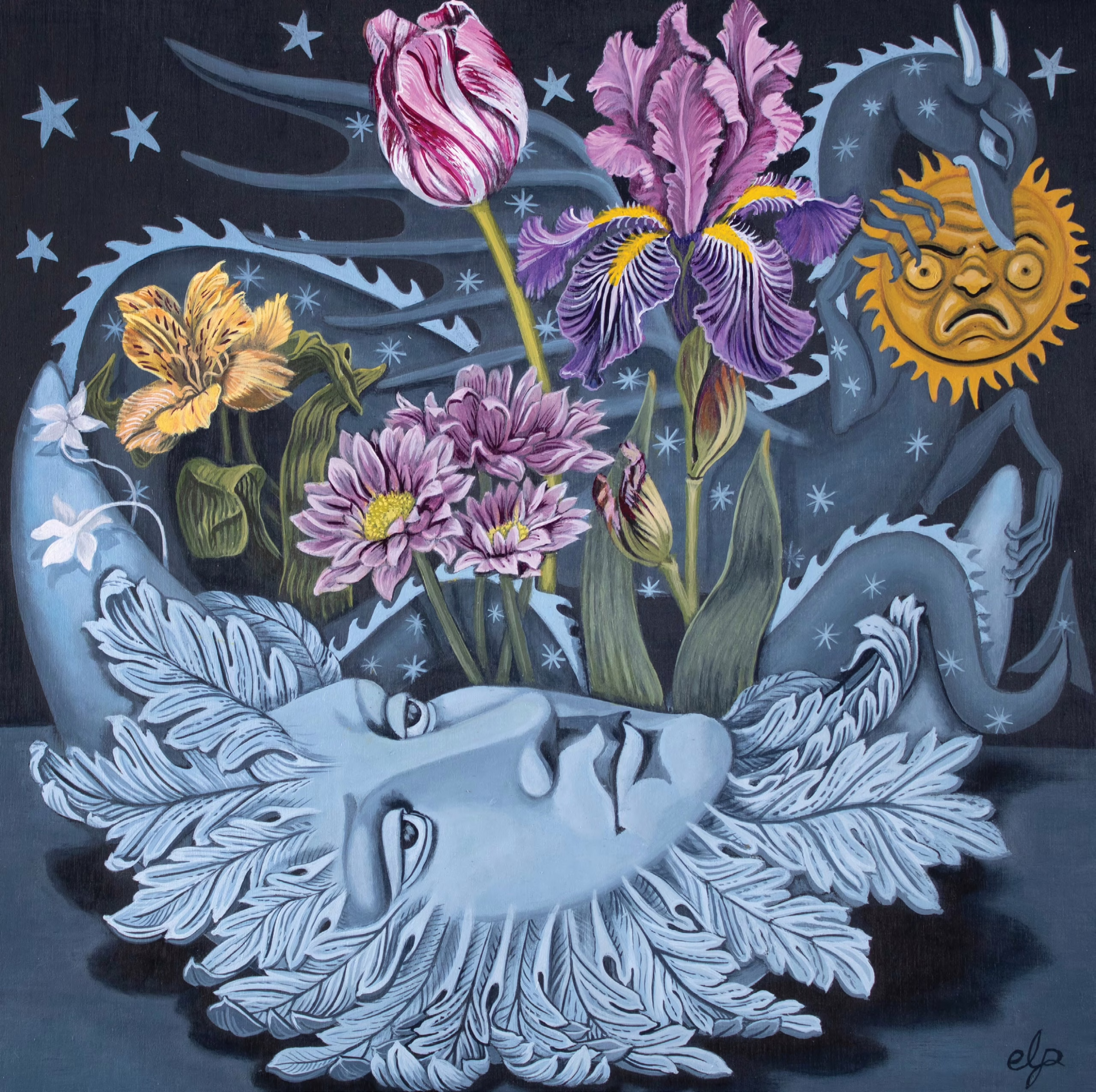 Bringing Down the Moon (left) is a nod to the Wiccan ritual of drawing down the moon, in which a high priestess calls upon the goddess (symbolized by the moon) to enter her body. This allows the goddess to speak through the priestess, sharing her wisdom, insight, and prophecy. In this painting, a dragon (another symbol Peebus uses often in her practice, to symbolize fate) has brought the moon a gift or an offering of the sun, which illuminates the moon and makes it the center of attention. “It’s an ancient power-grab turned on its head,” Peebus says.” Ultimately, it’s about the return of the matriarchal power structure and the fall of the patriarchy.”